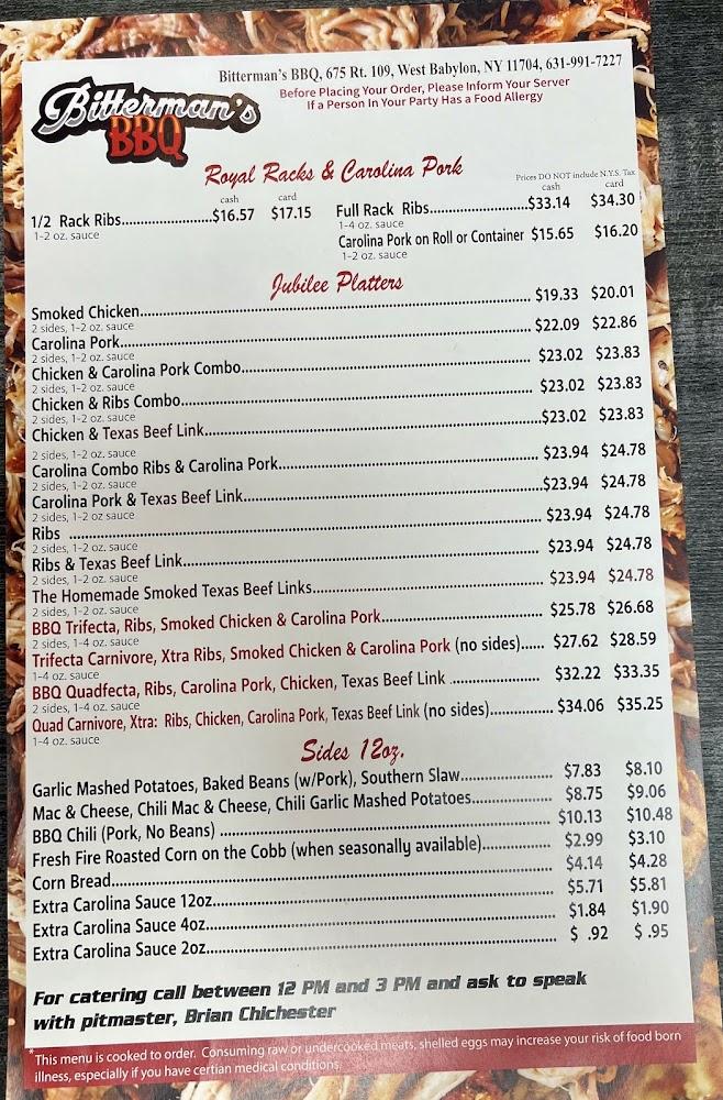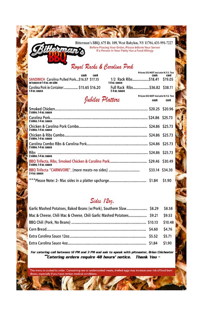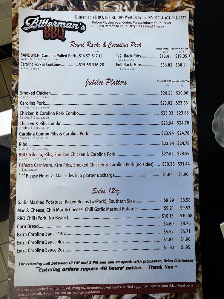 Welcome to Bitterman's BBQ, where we serve up unforgettable flavors using the finest cuts and high-quality ingredients. Nestled in West Babylon, NY, our signature cherry wood-smoked barbecue is slow-cooked to perfection. Enjoy a relaxed atmosphere whether you're dining solo, with a group, or grabbing a meal to-go. We’re popular for lunch and dinner, offering a diverse menu that includes mouthwatering ribs, pulled pork, and our famous baked beans. With convenient amenities like wheelchair-accessible entry, ample parking, and pet-friendly outdoor seating, Bitterman's BBQ is your go-to destination for authentic Southern barbecue. Reservations are welcome!
